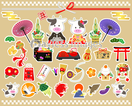 21年 丑年用 お正月イラストセット 商用利用可能な写真素材 イラスト素材ならストックフォトの定額制ペイレスイメージズ