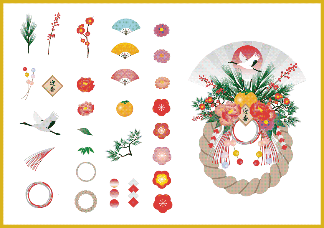 謹賀新年 正月シンボルの年賀状ハガキサイズテンプレートのイラスト素材