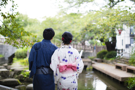 浴衣 着物 男女 カップル ポートレート 緑 屋外 外 全身 後ろ姿 手を繋ぐ 写真素材 フォトライブラリー Photolibrary